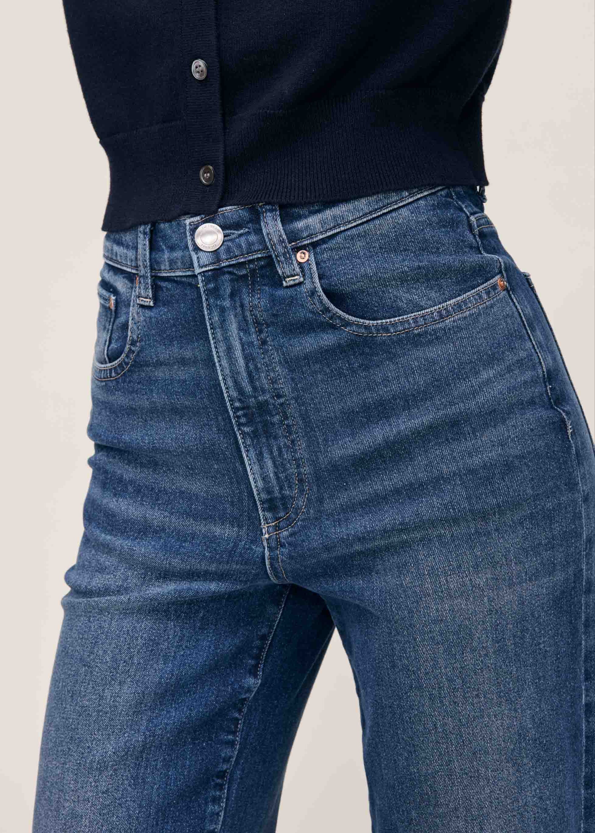 Karmine is a high rise refined wide leg with a 28" inseam for an easy and relaxed fit. This denim is in the Clearwater wash, which is a classic mid-indigo wash with subtle fading and whiskering. It features a silver shank, copper rivets, khaki stitching, a clean hem and an ecru patch.