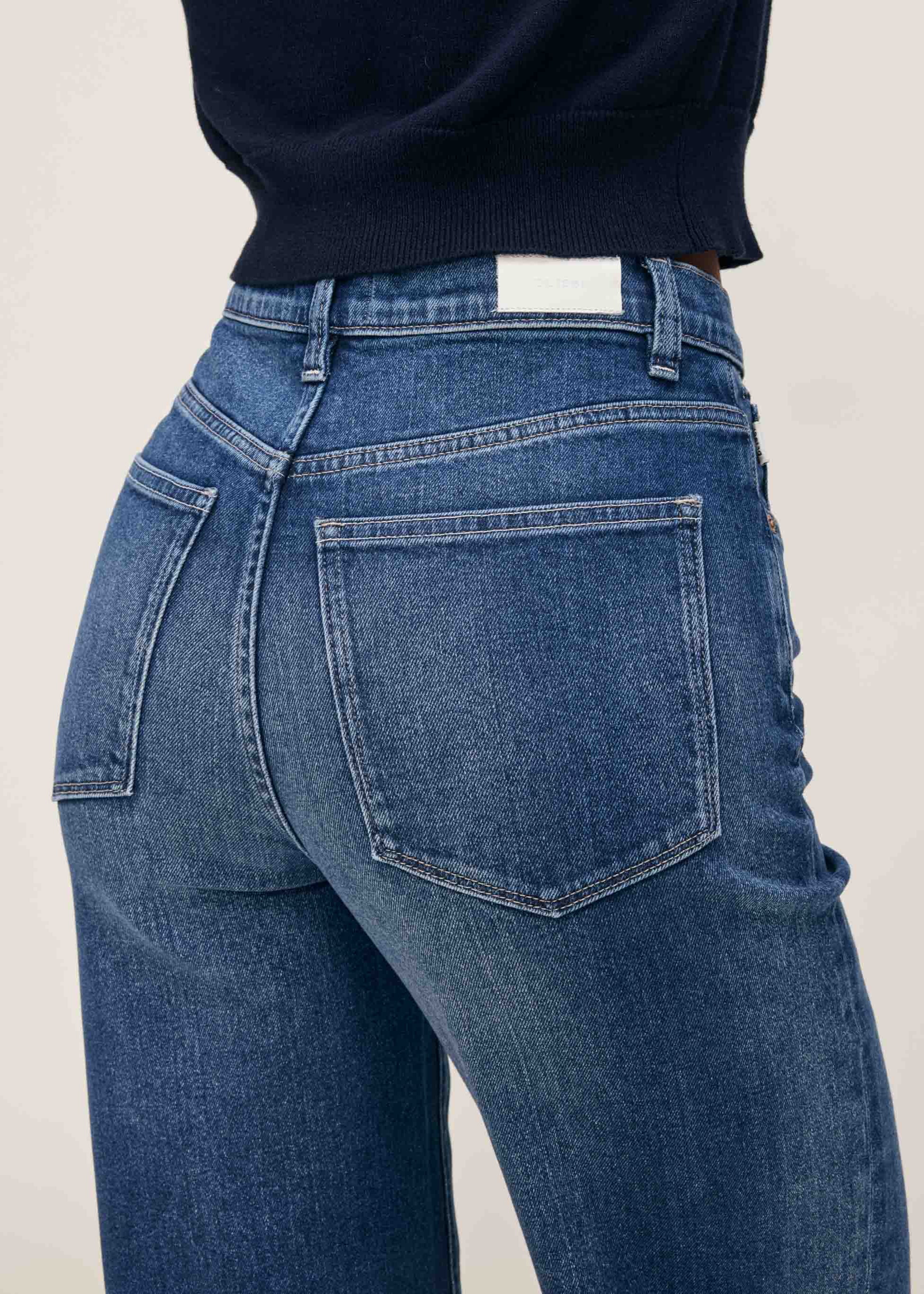 Fit: This is a straight wide leg denim with a very structured rigid fit. Model is 5'9" and wearing size 26.