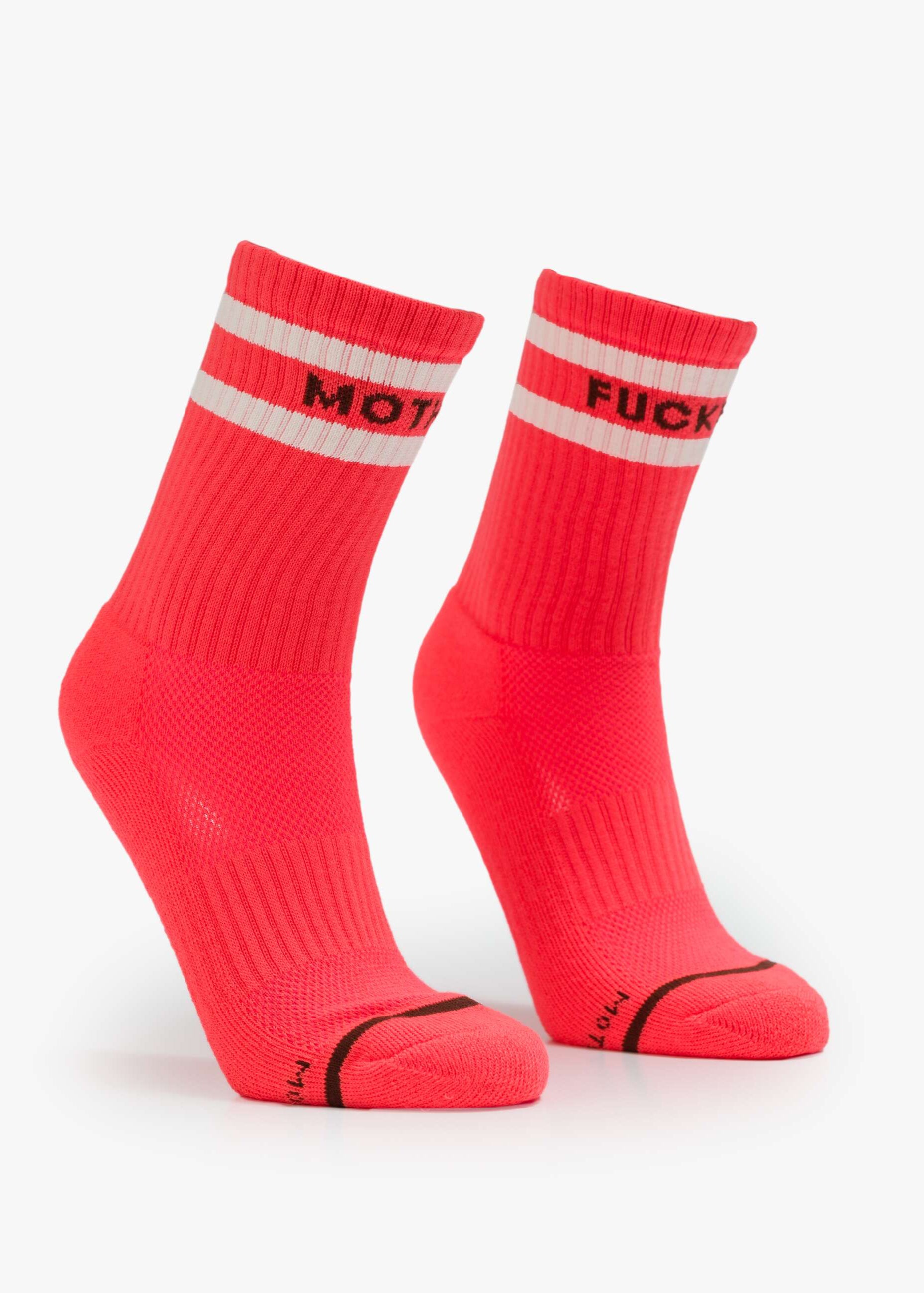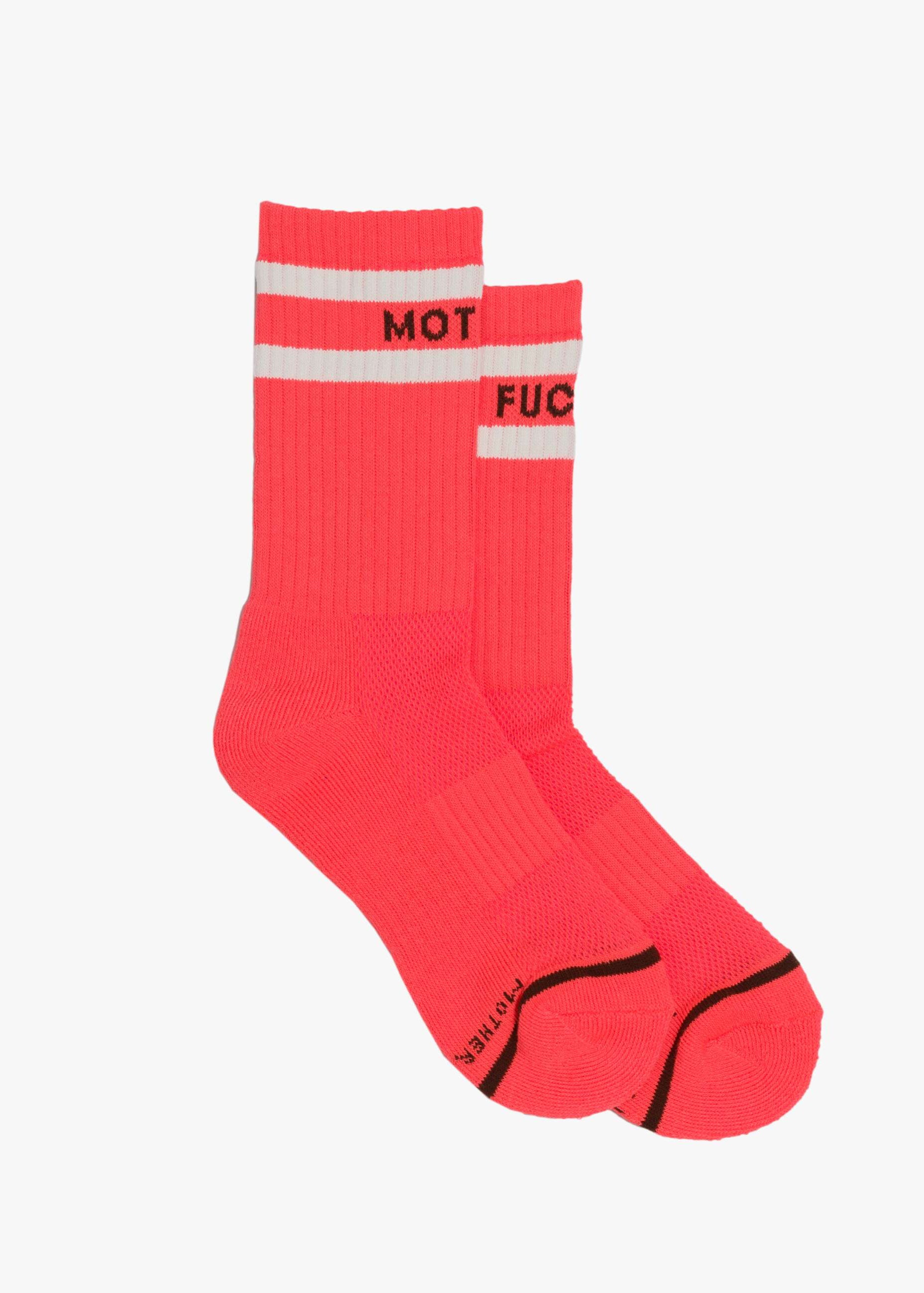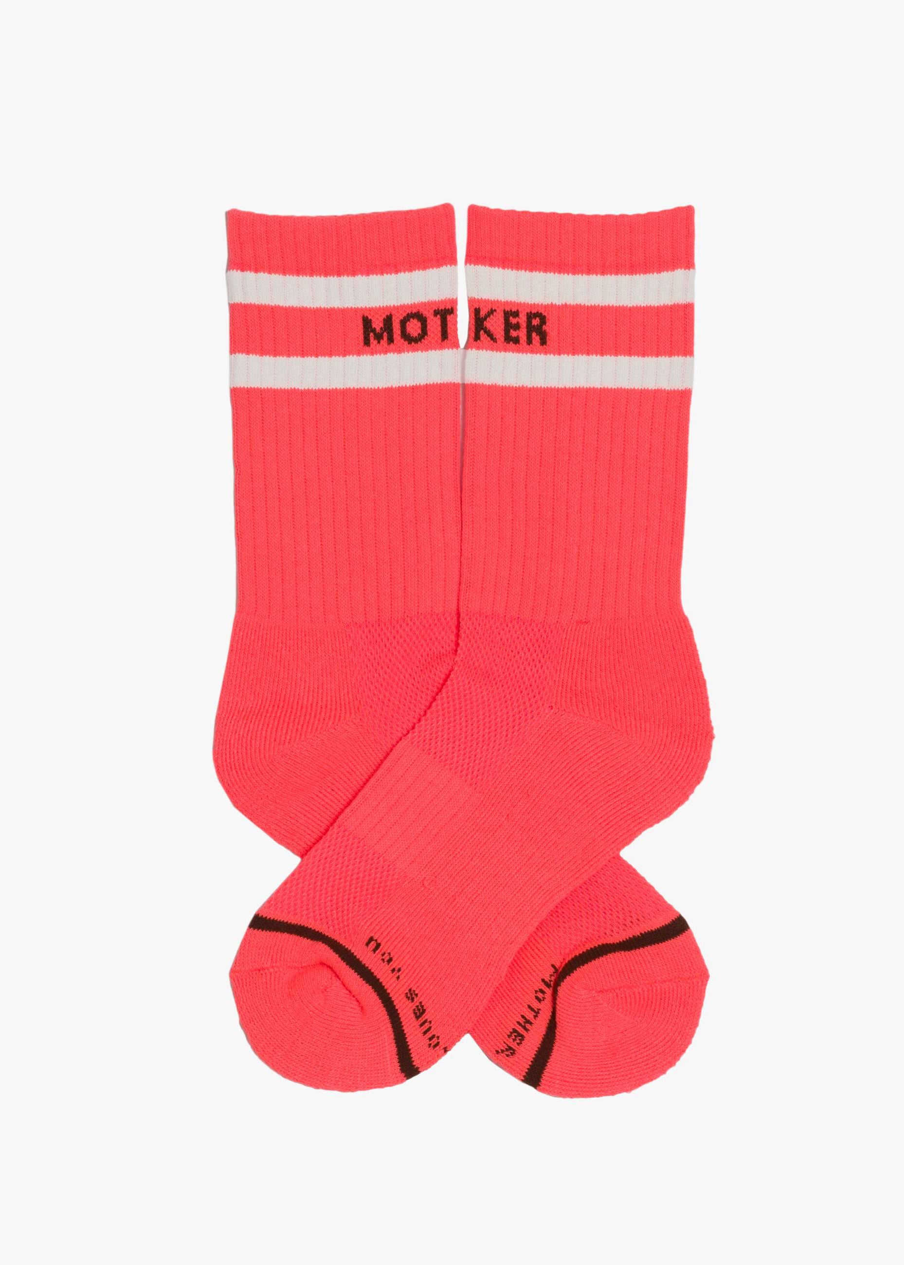 Watch your step. Classic tube socks with a bold message from MOTHER. Shown here in neon pink with brown lettering and cream details.
