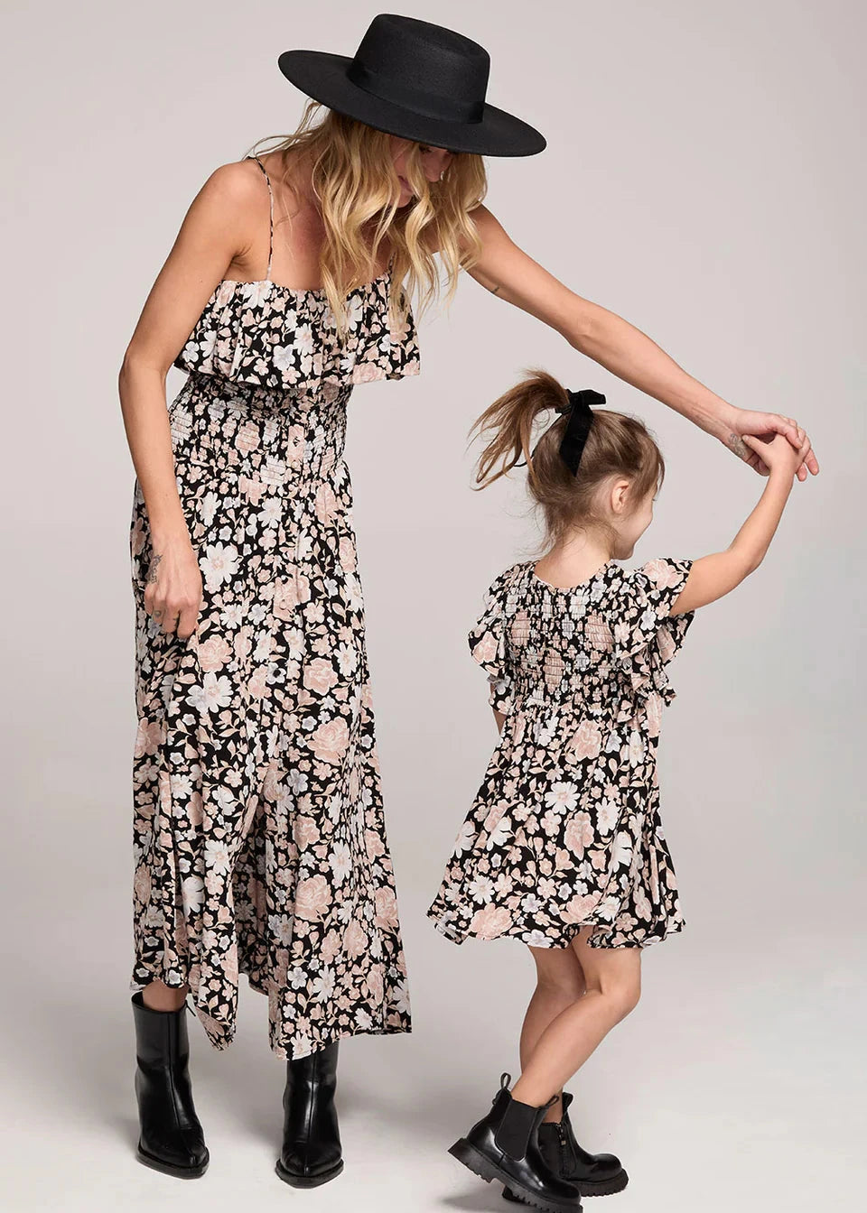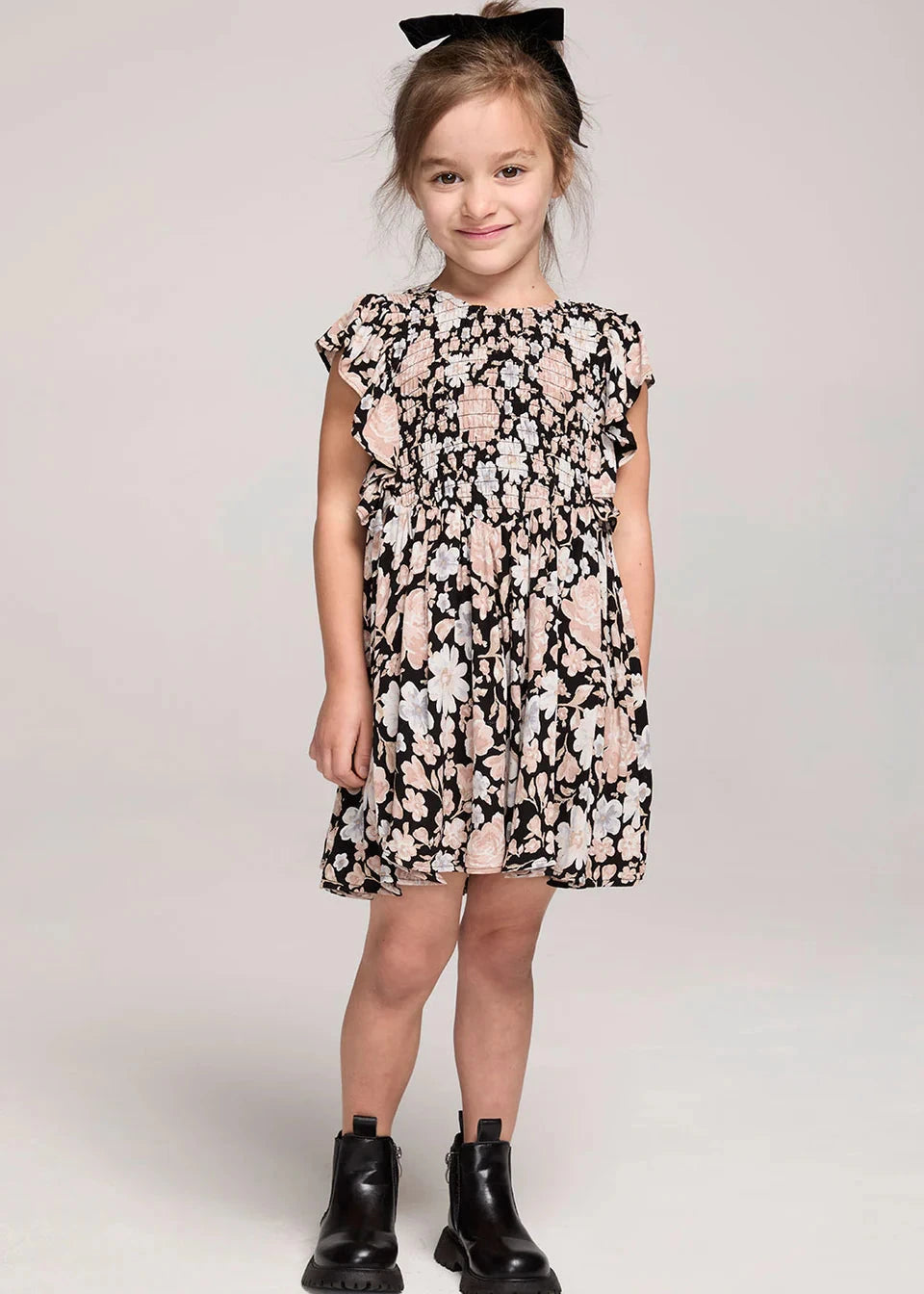 The Mirabelle Black Mini Dress features a full skirt with a gathered waist and easy pull-on style for comfortable wear. Its flutter sleeves and high neckline highlight a moody dark floral print, combining sweet charm with playful elegance—perfect for your next outdoor adventure