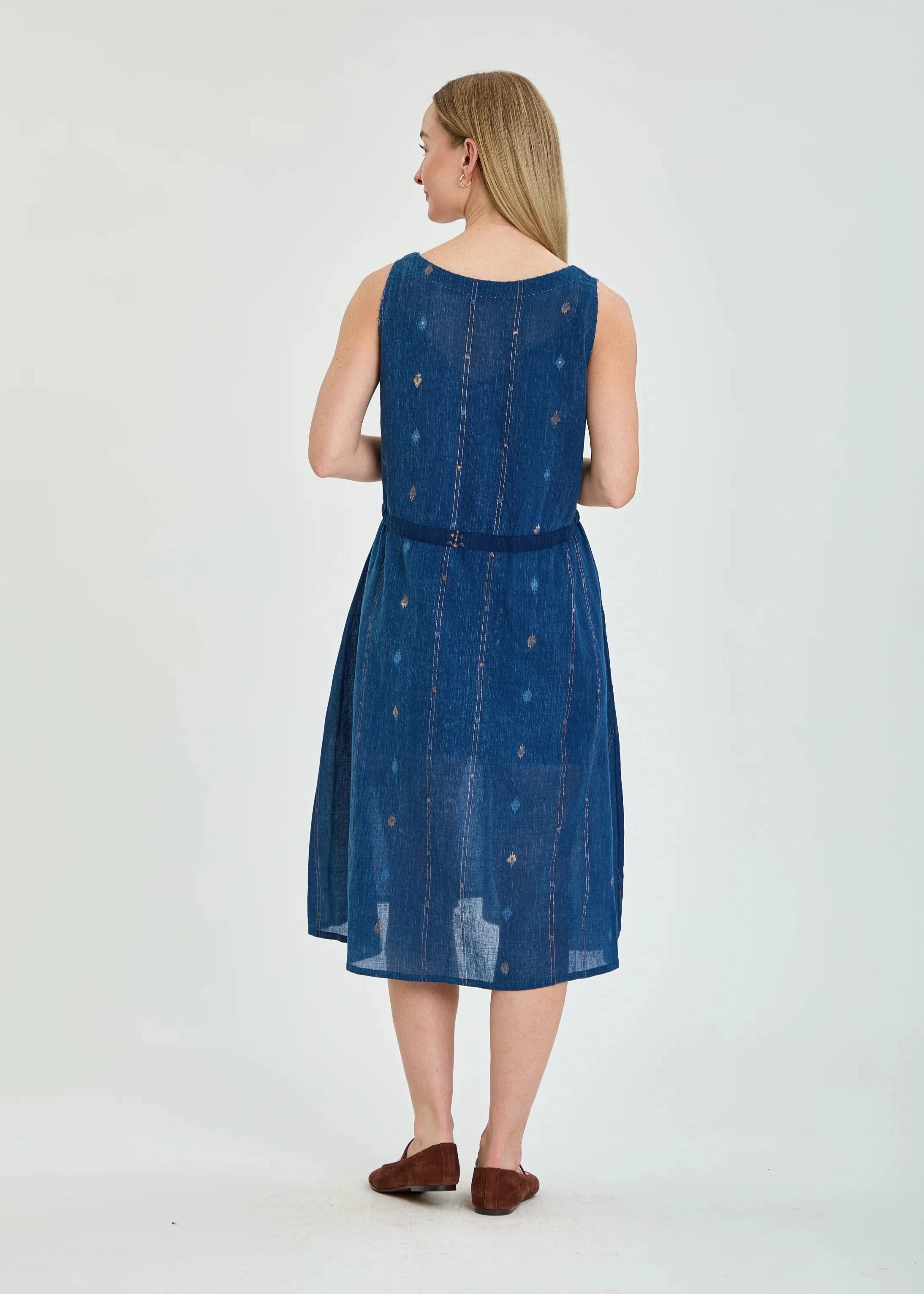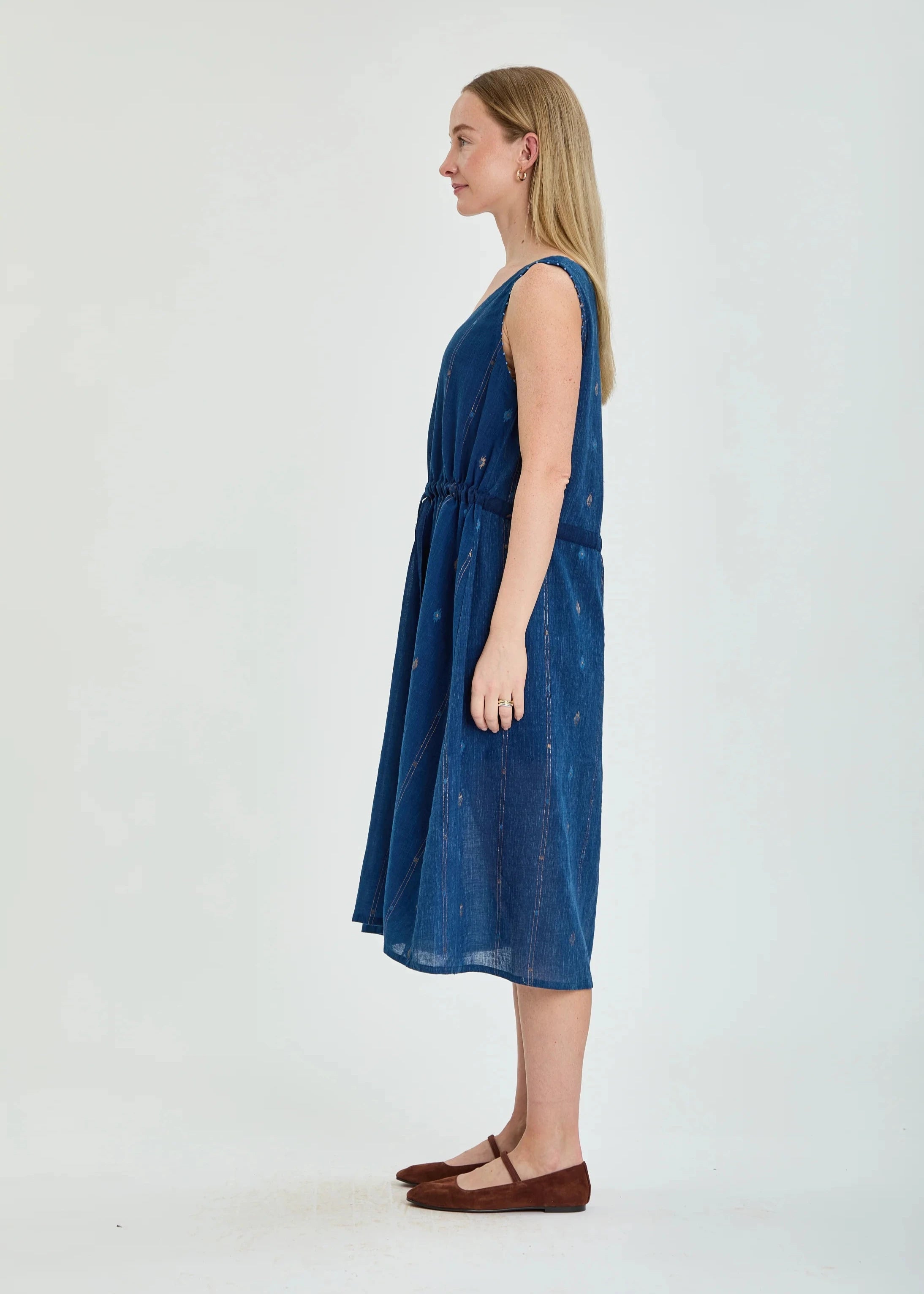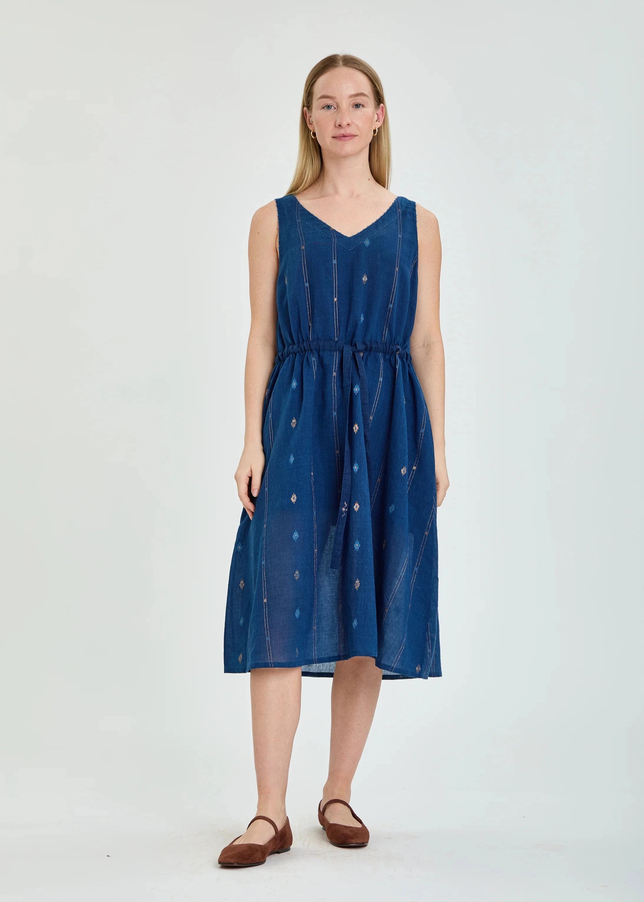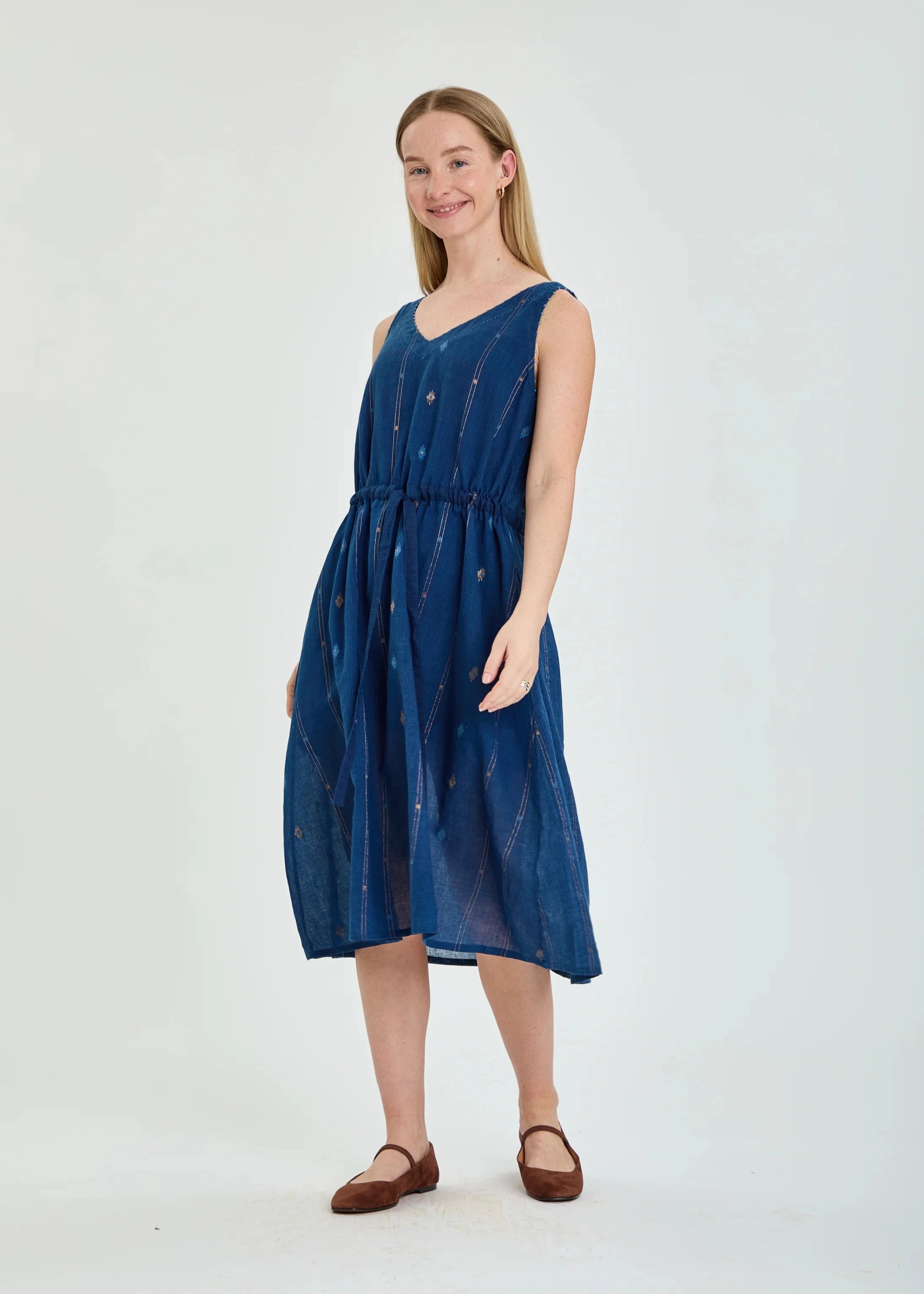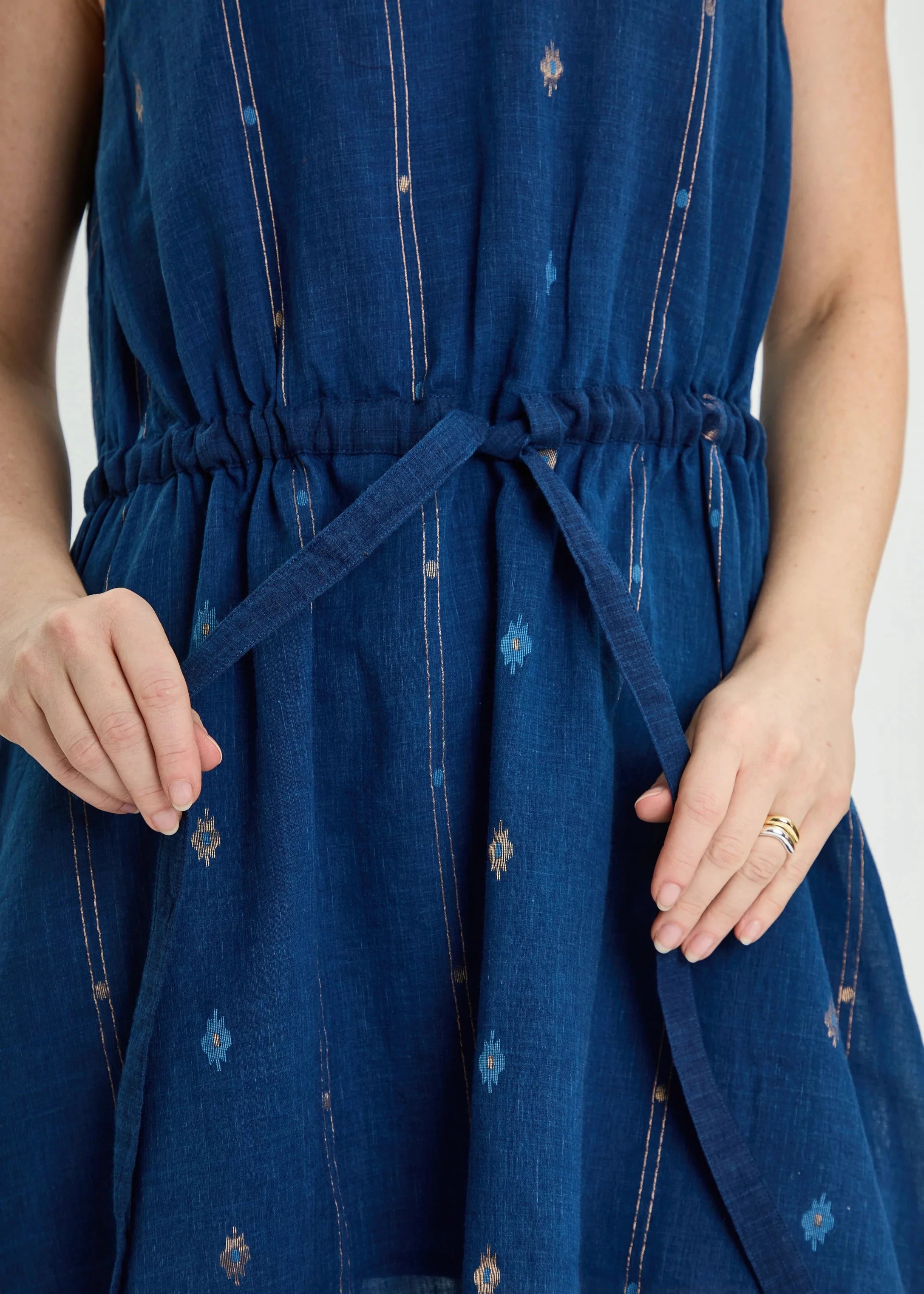 The Folly Dress boasts fun golden stripes on Indigo base and is meticulously crafted with beautiful handwoven Jamdani motifs all over. It also features a playful drawstring waist, and the fabric ages gracefully, becoming softer with every wash. This dress is a versatile staple for any season, adding sass and class to any ensemble. Wear as a cover up or dress it up with a liner.