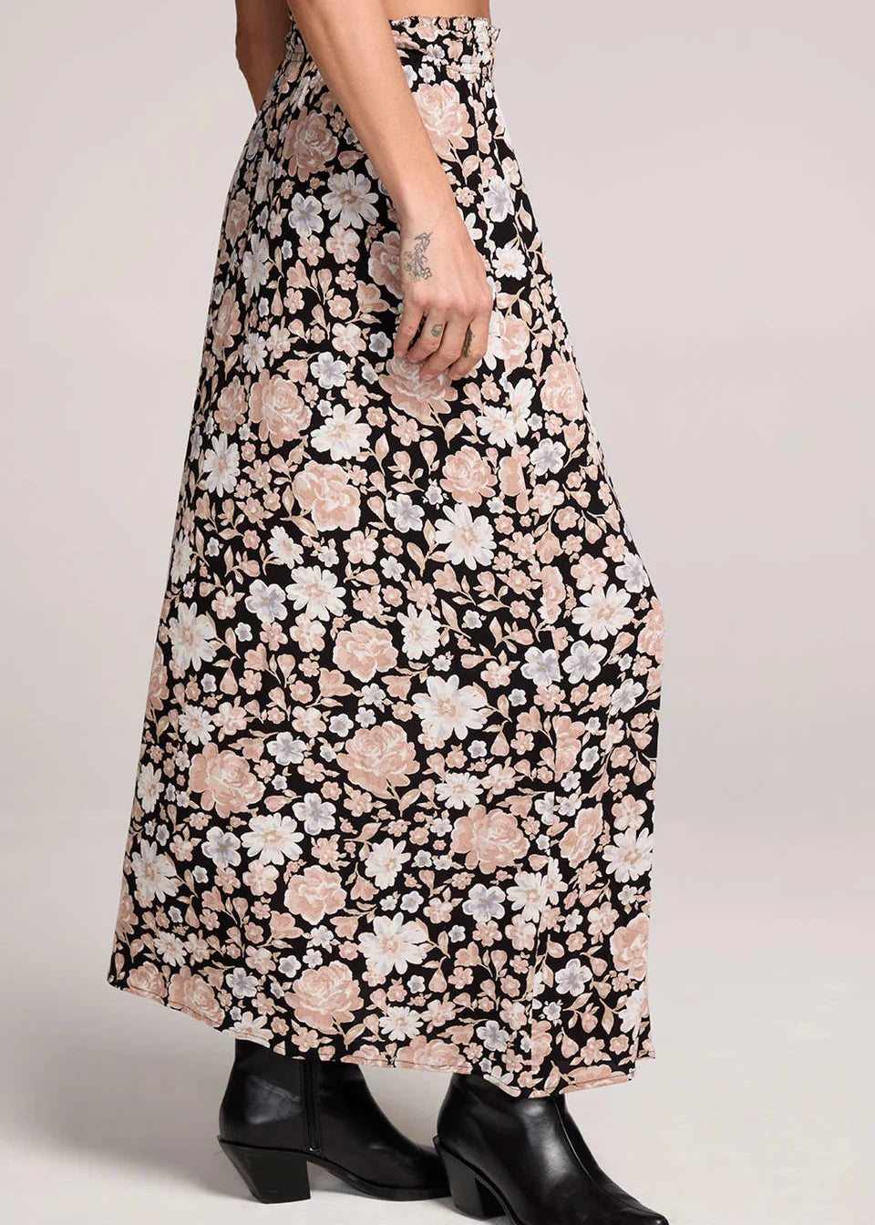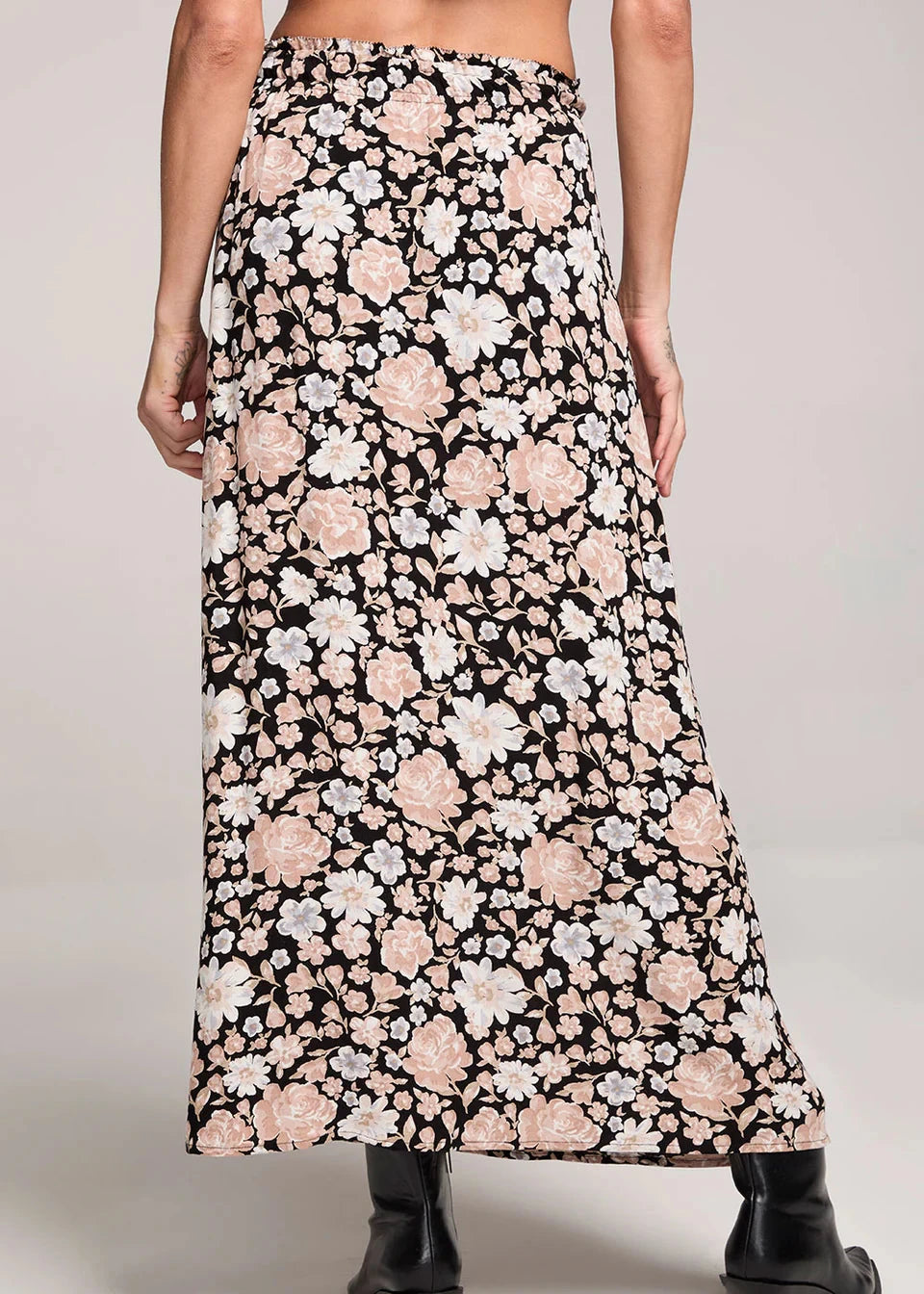 The Ida Midi Skirt showcases a classic silhouette with a romantic dark floral fabric, featuring a high slit on one side for effortless movement. Gathered at the waist for a flattering fit.
