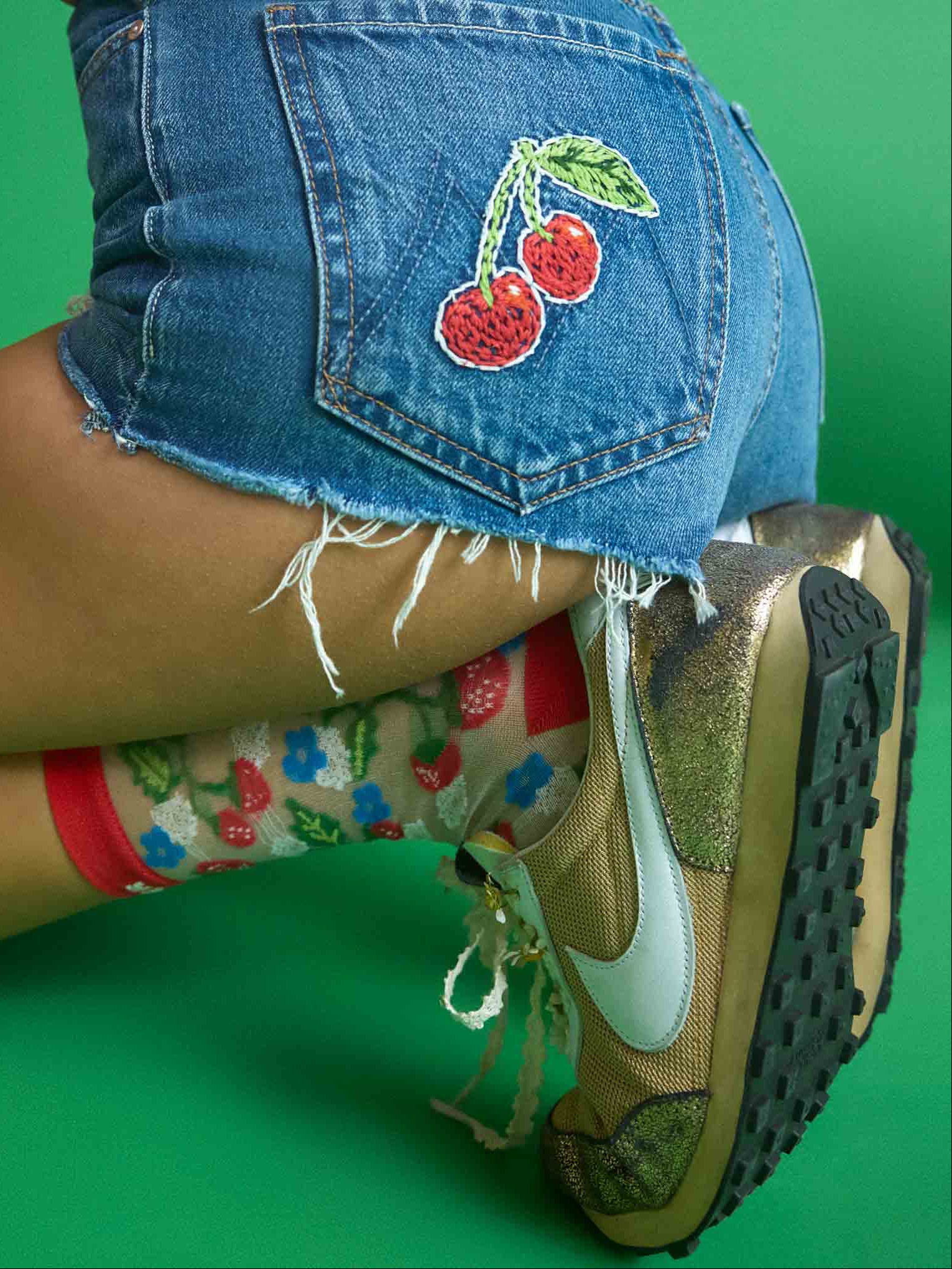 Ripe for the picking. Classic tube socks with an explicit message from MOTHER. The socks are designed in a translucent grey fabric with strawberry and flower graphics, red trim and text in white