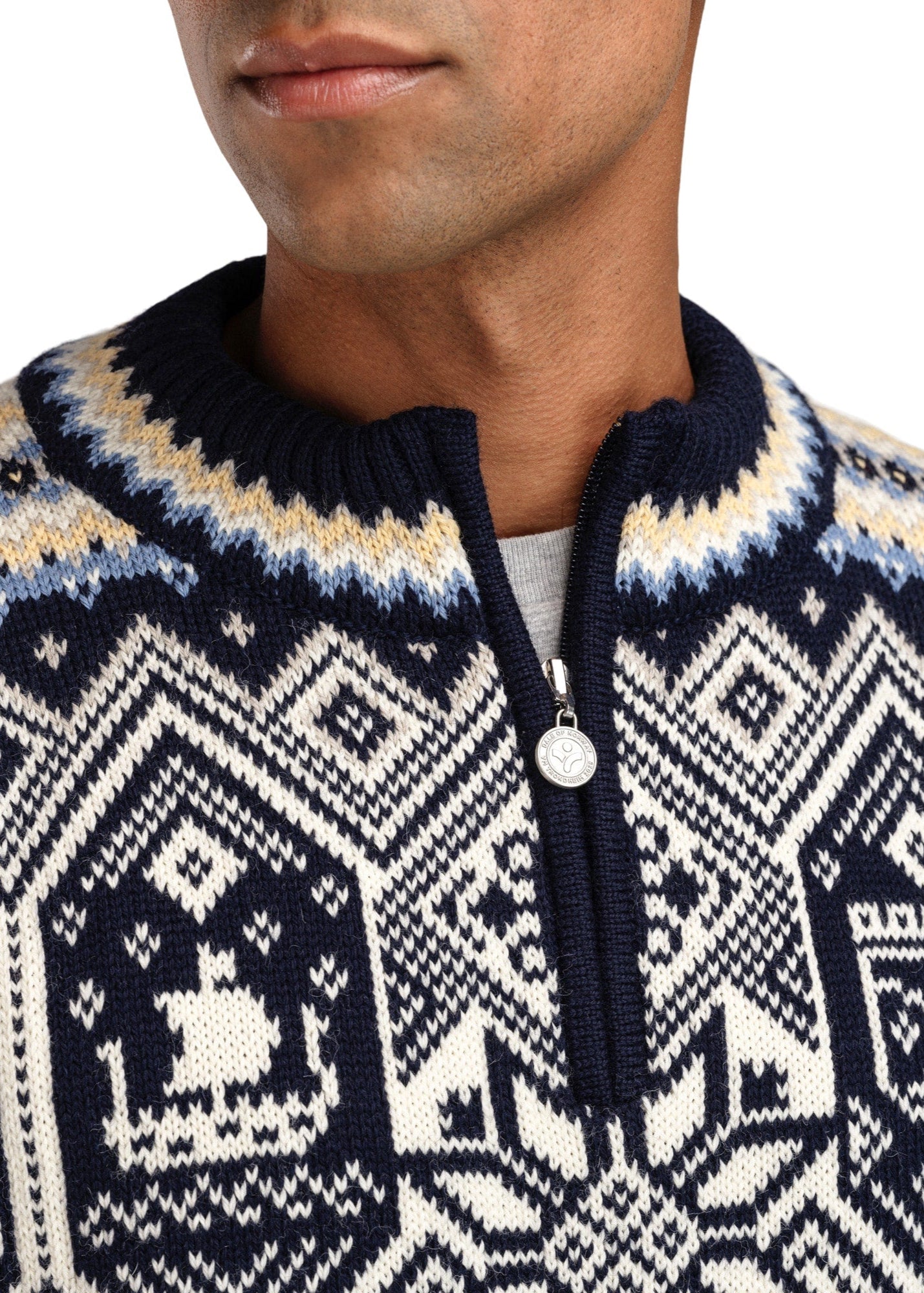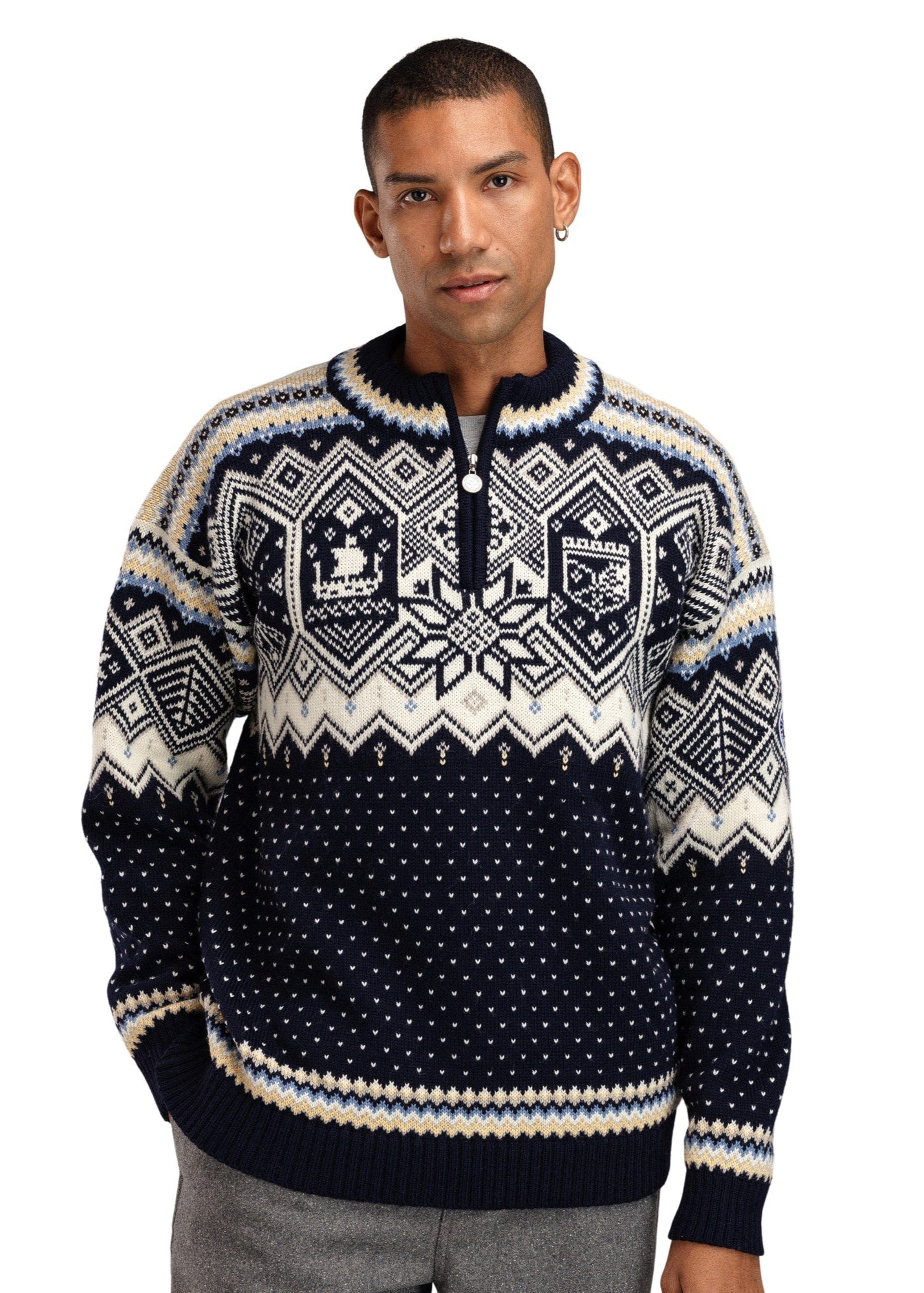 This is the official sweater for the 2025 Ski World Championships in Trondheim. A warm and comfortable wool sweater with a distinct retro touch, blending fresh colors with a classic expression. The pattern is inspired by the championship's values of diversity and inclusion, while drawing motifs from historical cultural landmarks in Trondheim. The sweater is knitted in 100% wool for long-lasting qualities and features a medium-high neck with a zipper.