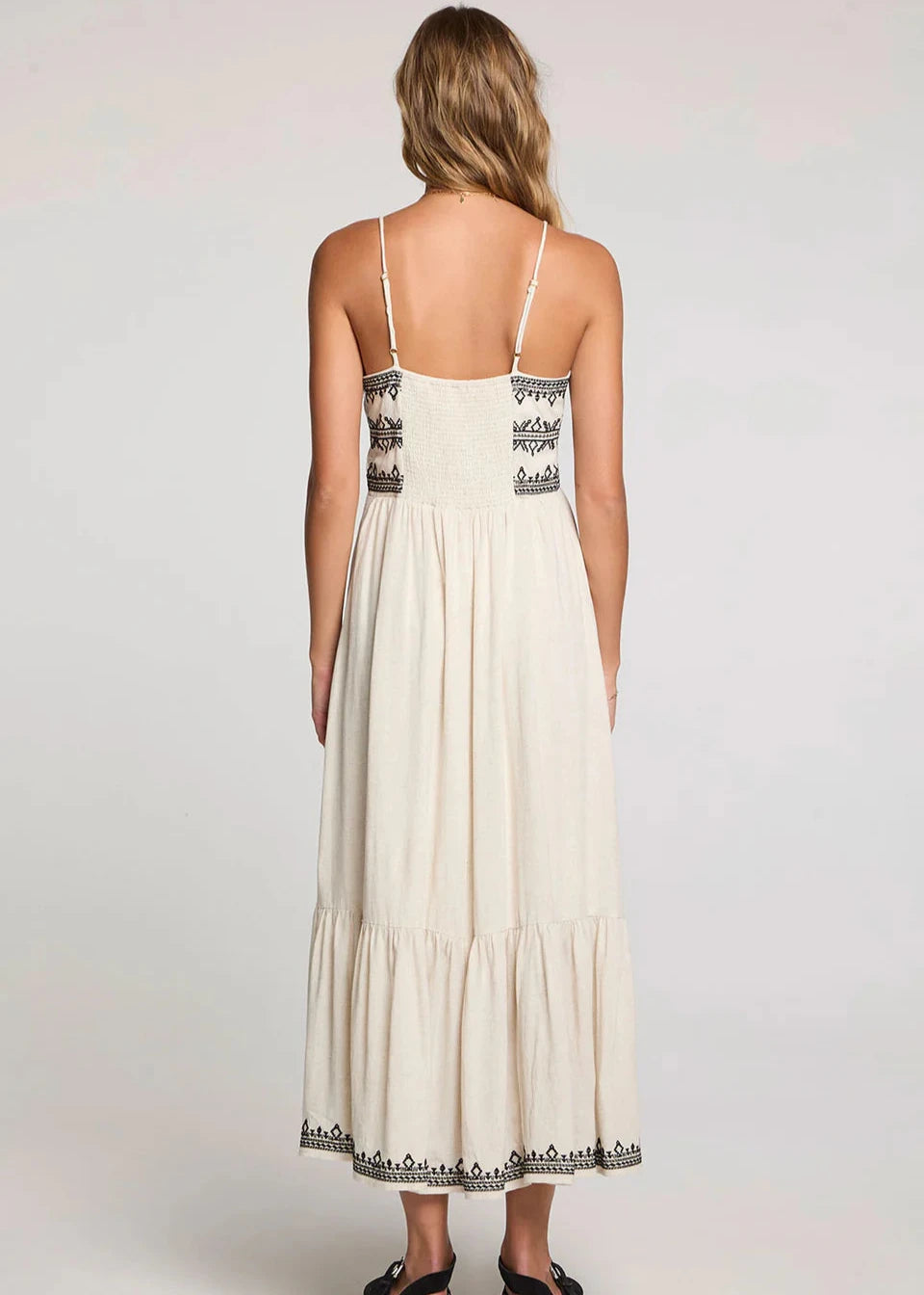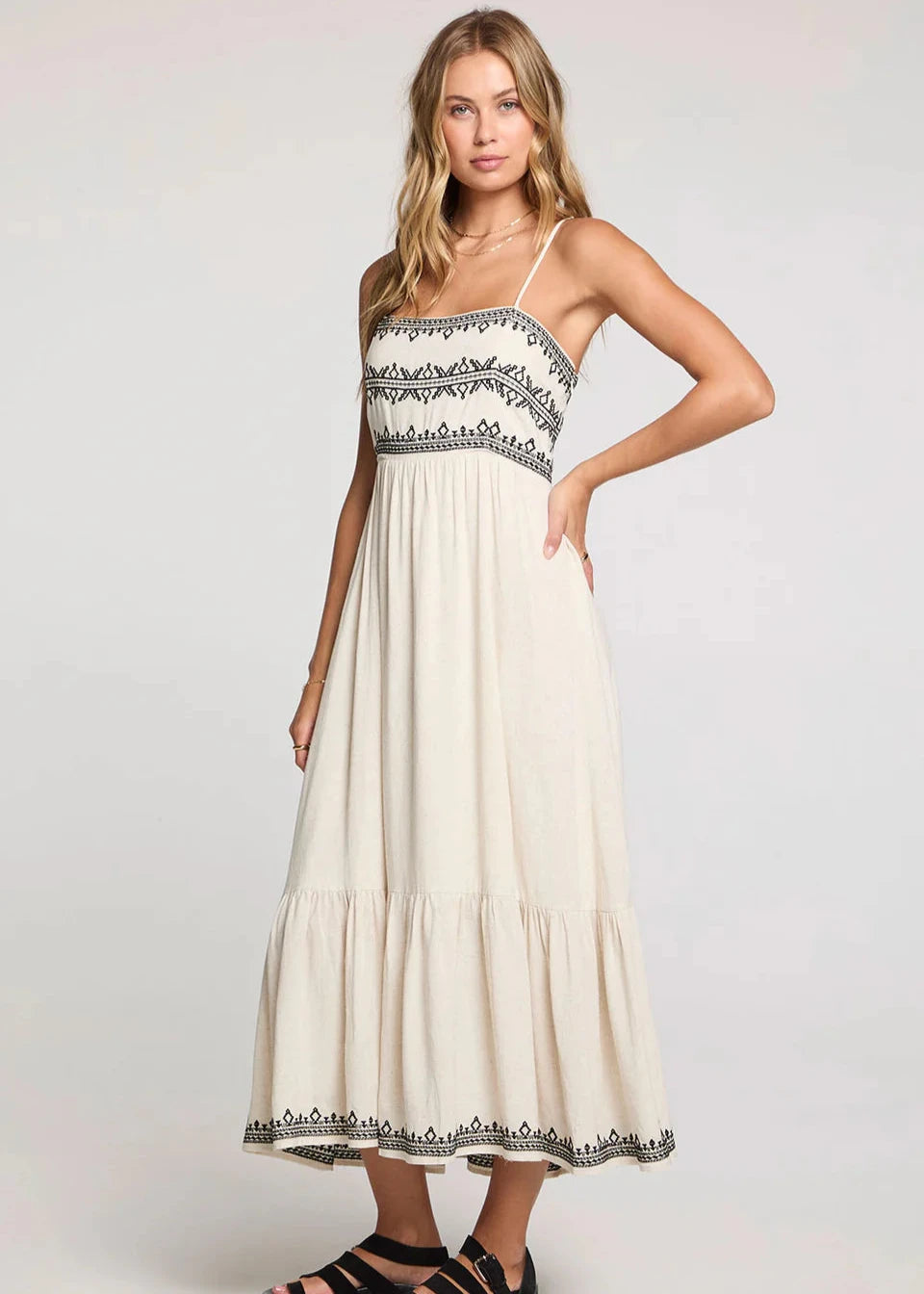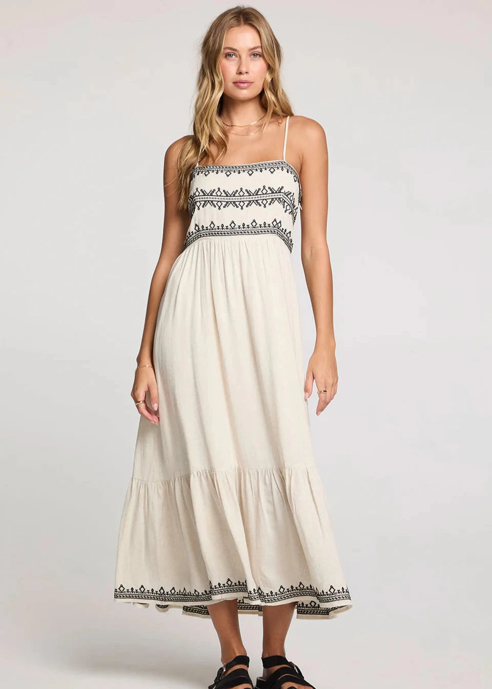 The Zaelie Midi Dress is a must-have for any occasion. The soft, natural fabric is adorned with petite black Moroccan-inspired detailing to create a timeless elegance. With a full skirt and ruffled tier at the bottom, this dress is perfect for the dance floor.
